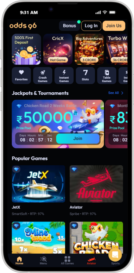 Users of Odds96 can access the APK Bonus of 50 credits and also receive a Welcome Bonus of 500% which has a wager instruction of x60 for Sports + Casino and 500% up to ₹100,000.